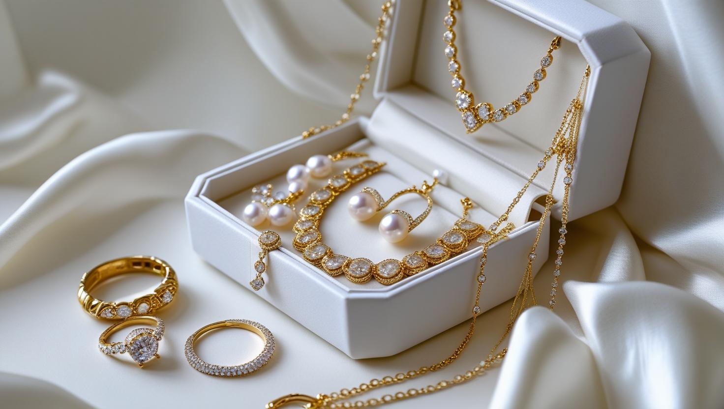 arka planında sade bir yer olan, beyaz takı kutusuna konulmuş takılar oluştur.