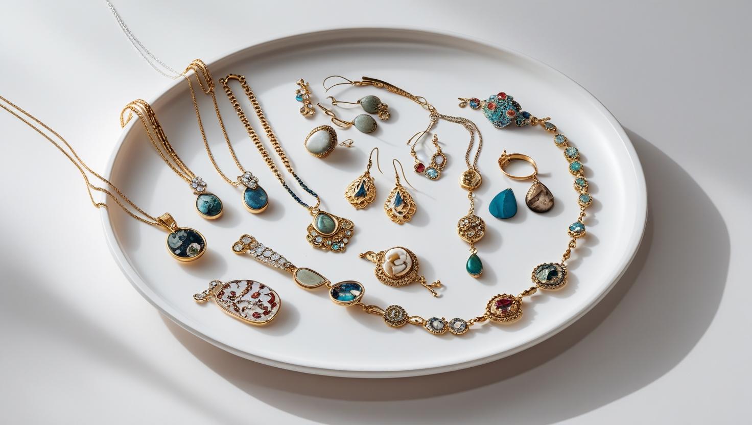 arka planında sade bir yer olan, beyaz takı tabağına konulmuş takılar oluştur. (1)