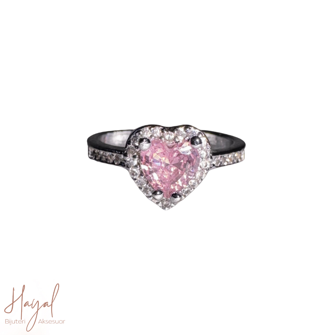 Gümüş renk, pembe taşlı, boyutu ayarlanabilir yüzük.